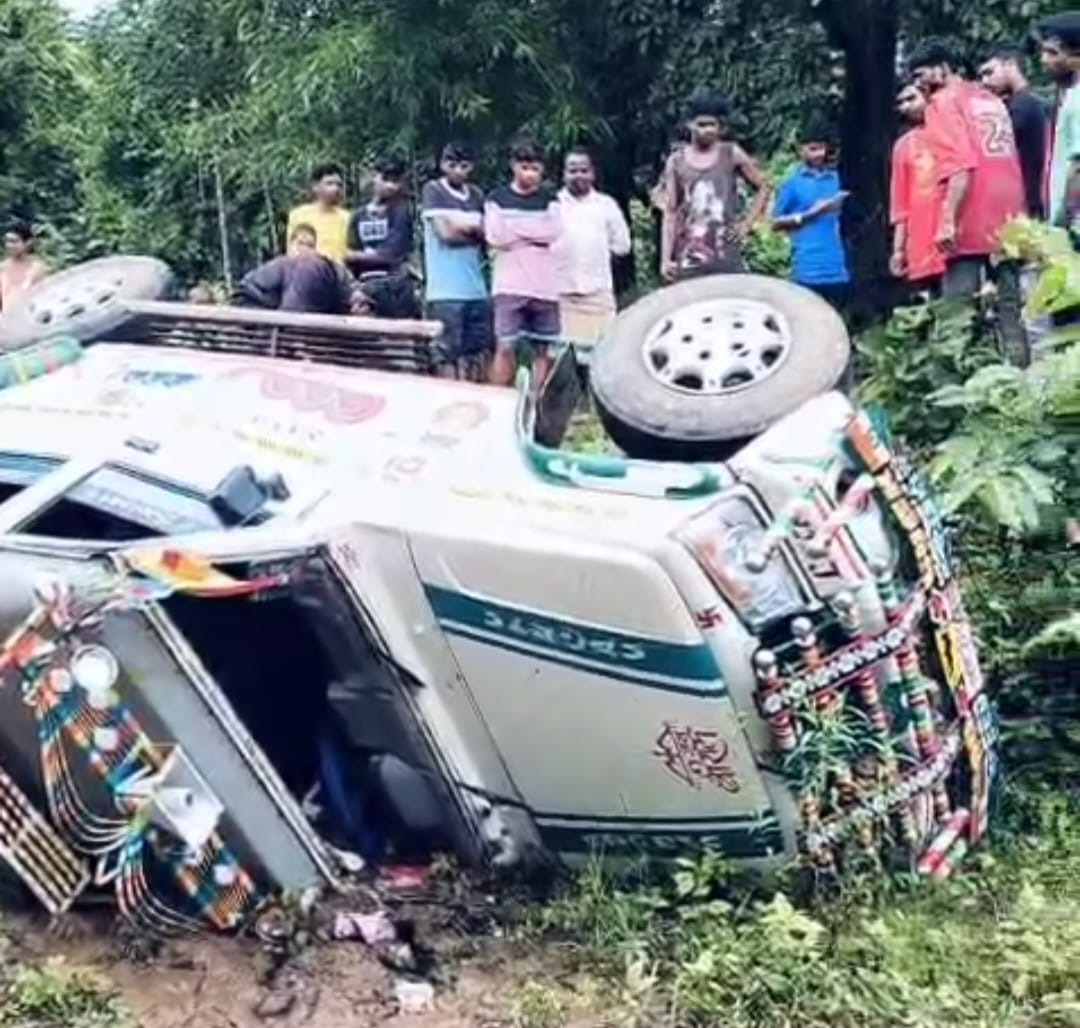 प्रत्यक्षदर्शियों ने बताया कि गाड़ी में लगभग 20 लोग सवार थे। गनीमत यह रही कि जिस जगह पर गाड़ी पलटी, वहां पानी जमा होने के कारण ज्यादा नुकसान नहीं हुआ। पुलिस मामले की जांच में जुटी है।