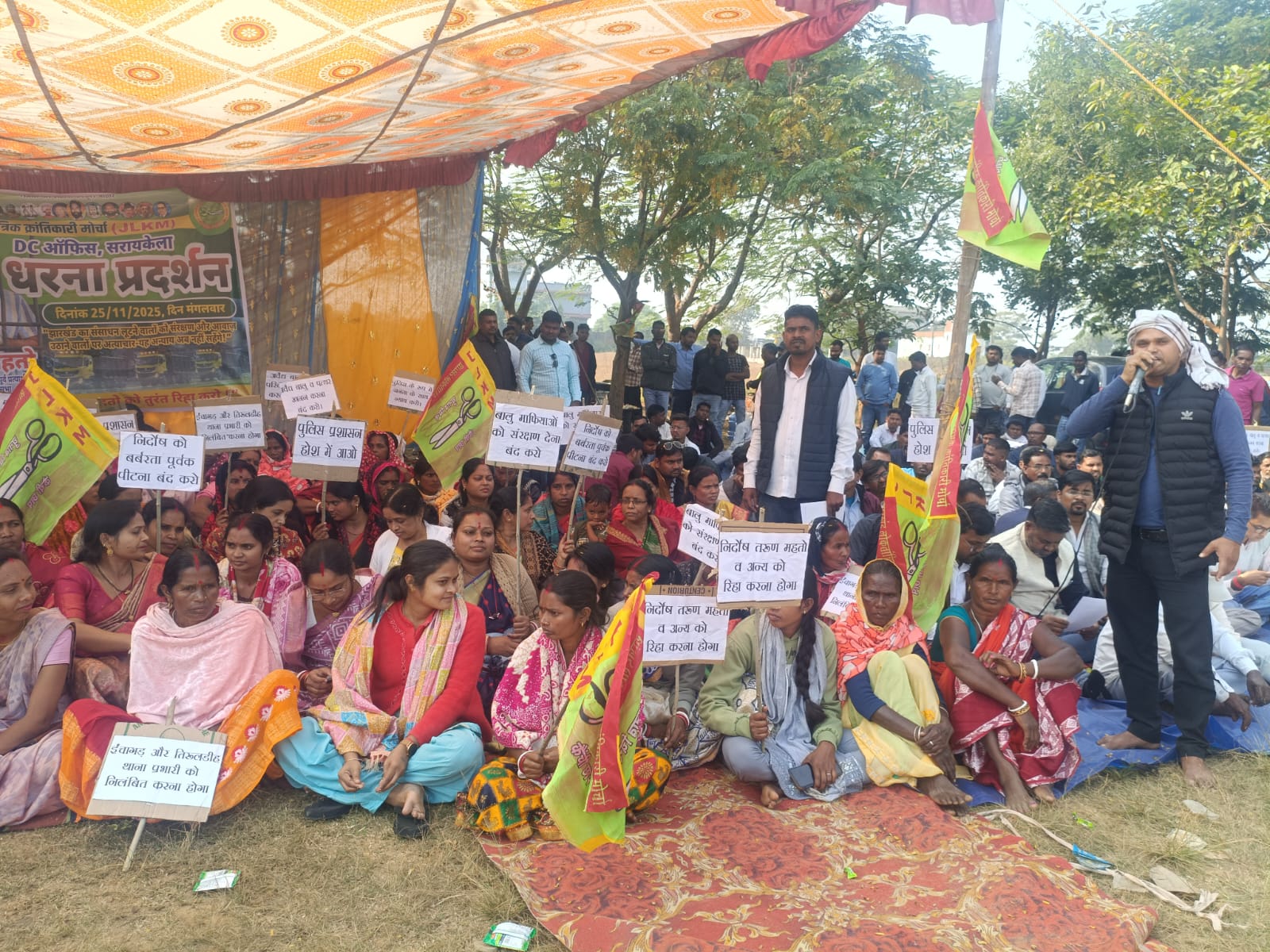 सरायकेला जिले के ईचागढ़ थाना क्षेत्र में अवैध बालू विवाद को लेकर पूर्व विधायक और JLKM के केंद्रीय उपाध्यक्ष तरुण महतो की गिरफ्तारी के विरोध में आज JLKM जिला कमेटी ने उपायुक्त कार्यालय के सामने एकदिवसीय शांतिपूर्ण धरना–प्रदर्शन आयोजित किया। धरना स्थल पर बड़ी संख्या में ग्रामीण, कार्यकर्ता और संगठन के पदाधिकारी उपस्थित रहे और उन्होंने प्रशासन के खिलाफ जोरदार नारेबाजी की।