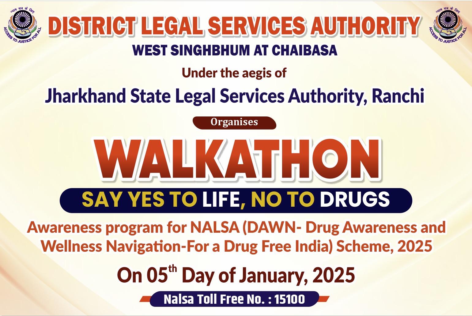 यह अभियान (DAWN) ड्रग्स अवेयरनेस एंड वेलनेस नेविगेशन फॉर ड्रग फ्री इंडिया स्कीम 2025 के अंतर्गत चलाया जा रहा है। इस अवसर पर प्रधान जिला एवं सत्र न्यायाधीश सह अध्यक्ष डीएलएसए चाईबासा मोहम्मद शाकिर, सभी न्यायिक पदाधिकारीगण, जिला प्रशासन के अधिकारी, एलएडीसी के अधिवक्ता, पैनल अधिवक्ता, अधिकार मित्र तथा न्यायालय के कर्मचारी शामिल होंगे।
