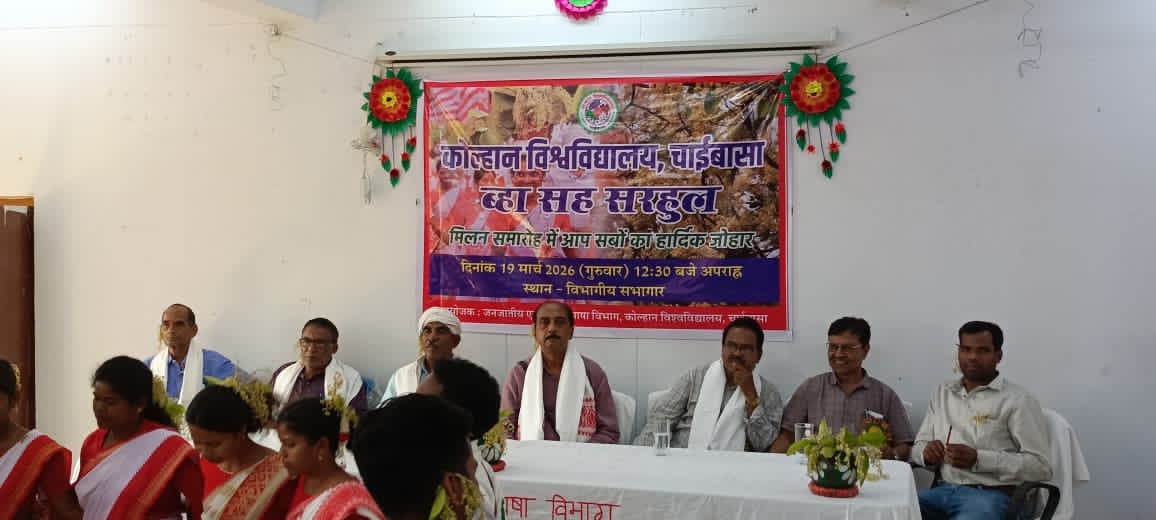 चाईबासा: कोल्हान विश्वविद्यालय, चाईबासा के जनजातीय एवं क्षेत्रीय भाषा (TRL) विभाग के विभागीय सभागार में गुरुवार को “ब्हा सह सरहुल मिलन समारोह” का भव्य आयोजन किया गया। कार्यक्रम की अध्यक्षता विभागाध्यक्ष सह मानविकी संकायाध्यक्ष डॉ. तपन कुमार खाँड़ा ने की। समारोह की शुरुआत राष्ट्रीय गीत वंदे मातरम् से हुई, जबकि समापन राष्ट्रीय गान के साथ किया गया।