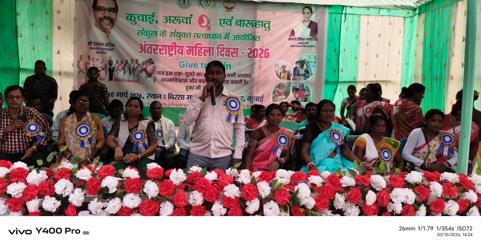 कुचाई प्रखंड के बिरसा मुंडा स्टेडियम में मंगलवार को कुचाई, अरूवां एवं बारूहातु संकुल के संयुक्त तत्वावधान में अंतरराष्ट्रीय महिला दिवस-2026 हर्षोल्लास के साथ मनाया गया. कार्यक्रम का उद्घाटन जिला परिषद अध्यक्ष सोनाराम बोदरा, प्रखंड प्रमुख गुड्डी देवी,सीओ सुषमा सोरेन,समाजसेवी बासंती गागराई, जिला परिषद सदस्य झिंगी हेम्ब्रम, सांसद प्रतिनिधि मानसिंह मुंडा, विधायक प्रतिनिधि धर्मेंद्र कुमार मुंडा, मुखिया लुदरी हेम्ब्रम,करम सिंह मुंडा ने संयुक्त रूप से किया. इस दौरान जिला परिषद अध्यक्ष सोनाराम बोदरा ने कहा कि पूरे विश्व में अंतरराष्ट्रीय महिला दिवस मनाया जाता है, जिसमें महिलाएं अपने हक और अधिकार पाने के लिए इसकी शुरुआत एक आंदोलन से की थी.