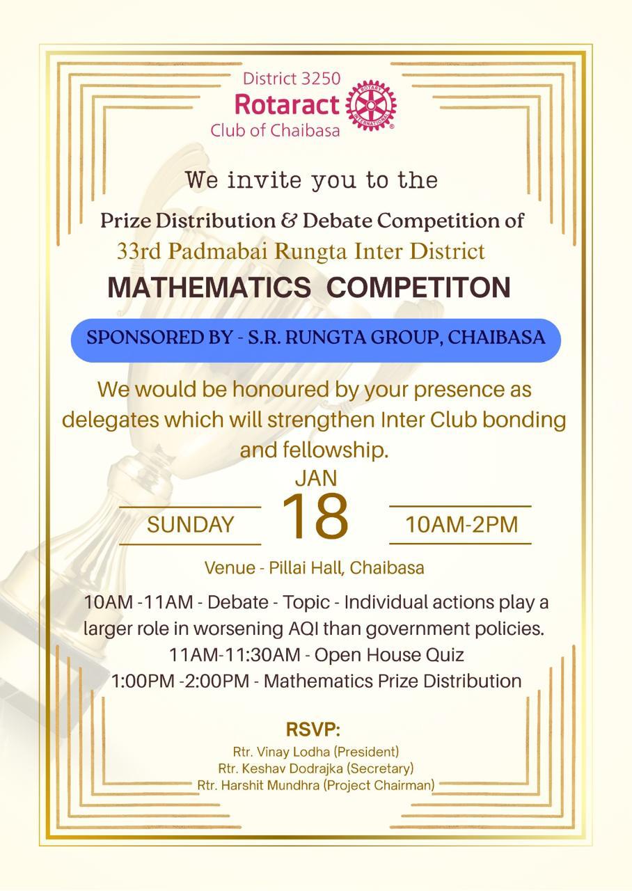 रोटरैक्ट क्लब ऑफ चाईबासा आयोजित करेगा 33वीं पदमाबाई रुंगटा अंतर-विद्यालय गणित प्रतियोगिता का पुरस्कार वितरण एवं वाद–विवाद कार्यक्रम