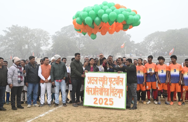 चाईबासा(प्रकाश कुमार गुप्ता): स्थानीय फुटबॉल ग्राउंड में त्रिदिवसीय अटल स्मृति फुटबॉल प्रतियोगिता 2025 का रविवार को भव्य शुभारंभ किया गया। उद्घाटन समारोह में पूर्व मुख्यमंत्री मधु कोड़ा एवं पूर्व सांसद गीता कोड़ा मुख्य अतिथि के रूप में उपस्थित रहे।